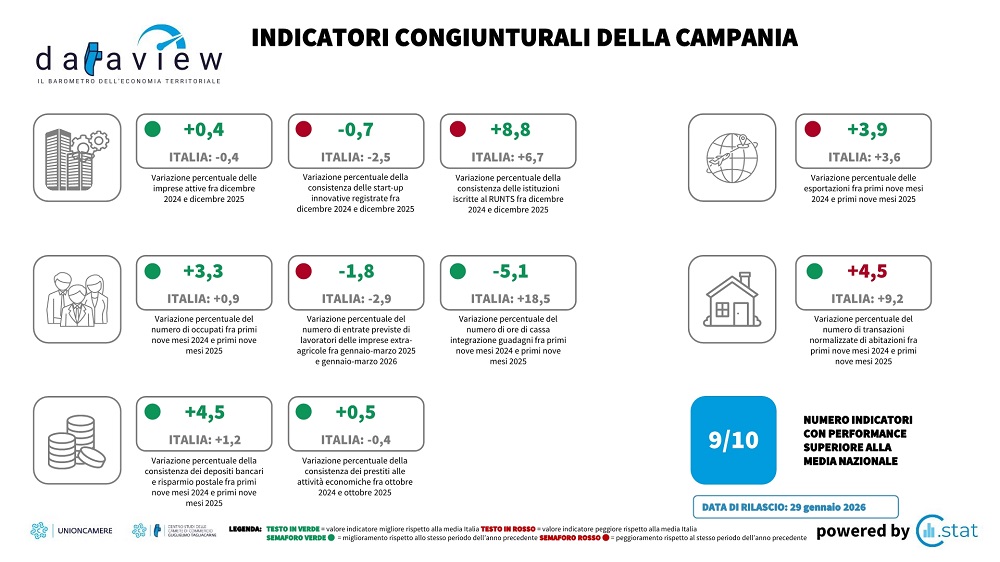 2) Infografiche trimestrali contenenti indicatori con confronti sull'anno precedente e la media Italia.