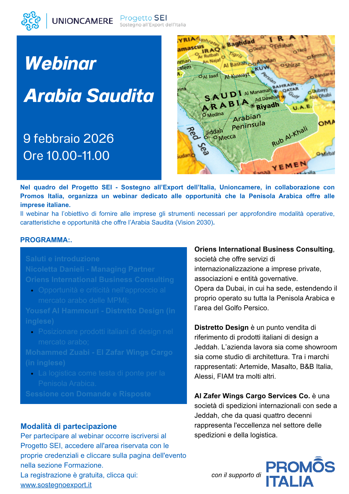 Per guidare le aziende in questo scenario in forte espansione, Unioncamere, in collaborazione con Promos Italia e nell'ambito del Progetto SEI (Sostegno all’Export dell’Italia), organizza un webinar operativo dedicato alle opportunità e alle modalità d'accesso alla Penisola Arabica.