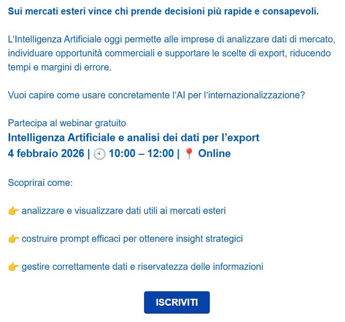 Webinar - Come usare l’AI per prendere decisioni più rapide sui mercati esteri - 4 febbraio 2026 ore 10-12